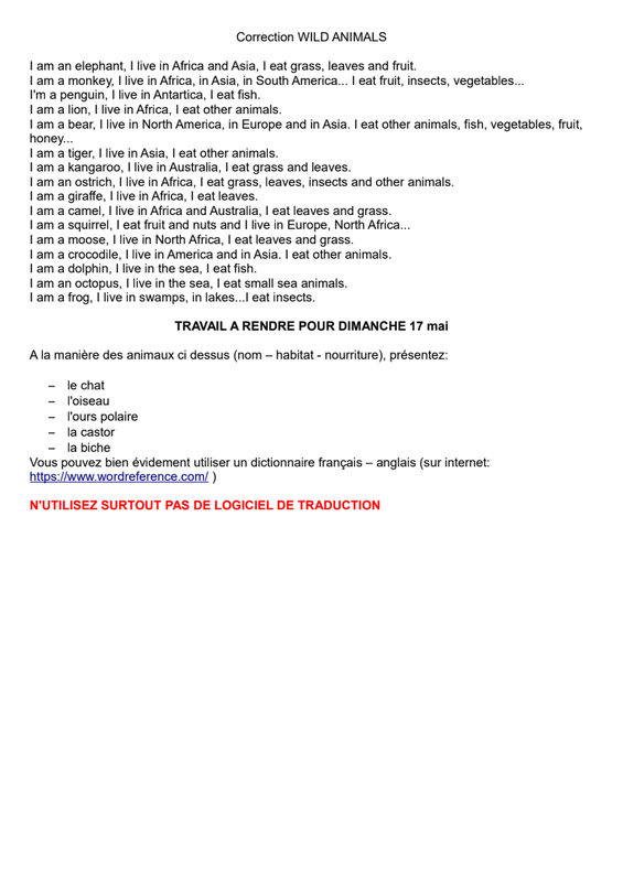 Aujourd'hui deux documents: la correction des articles indéfinis en anglais et un nouveau doc intitulé ANIMALS. Il faut mettre le numéro correspondant à la bonne photo d'animal. Ensuite, allez sur l'espace partagé que j'ai crée pour vous sur l'ENT (il s'appelle 6e Bilangue: https://ent77.seine-et-marne.fr/workspace/workspace#/folder/0030d9d5-e4f6-4c21-9149-a57eb330d595). Vous y trouverez un enregistrement afin d'écouter et de répéter les noms de ces animaux.