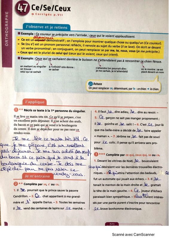 1) Corriger la fiche d'exercices sur les homophones ce, se et ceux (attention, une petite erreur s'est glissée dans l'encadré en bleu, je l'ai corrigée et vous demande de faire de même) et réviser la règle.