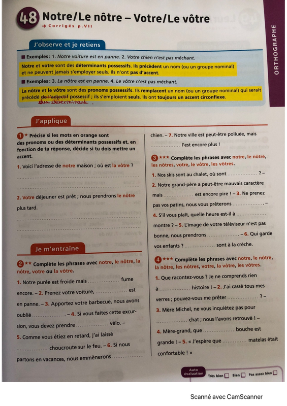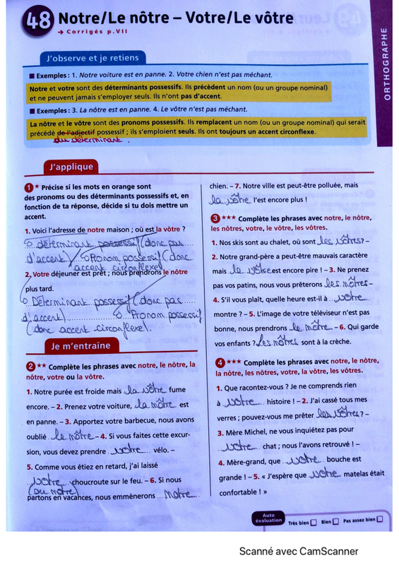 2) Compléter la fiche : notre, le nôtre, votre, le vôtre (et apprendre les encadrés en jaune).