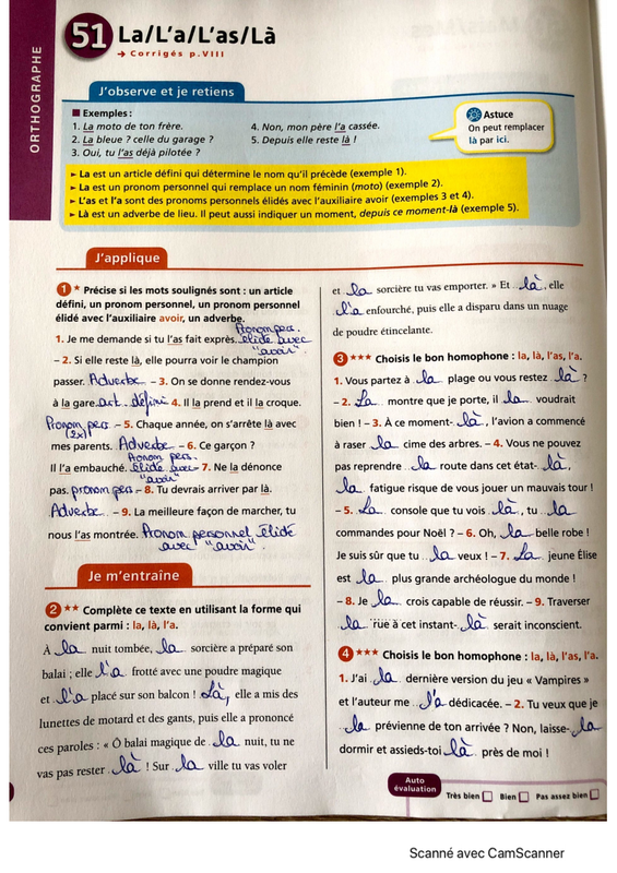1) Corriger la fiche concernant les homophones la, là, l'a, l'as.